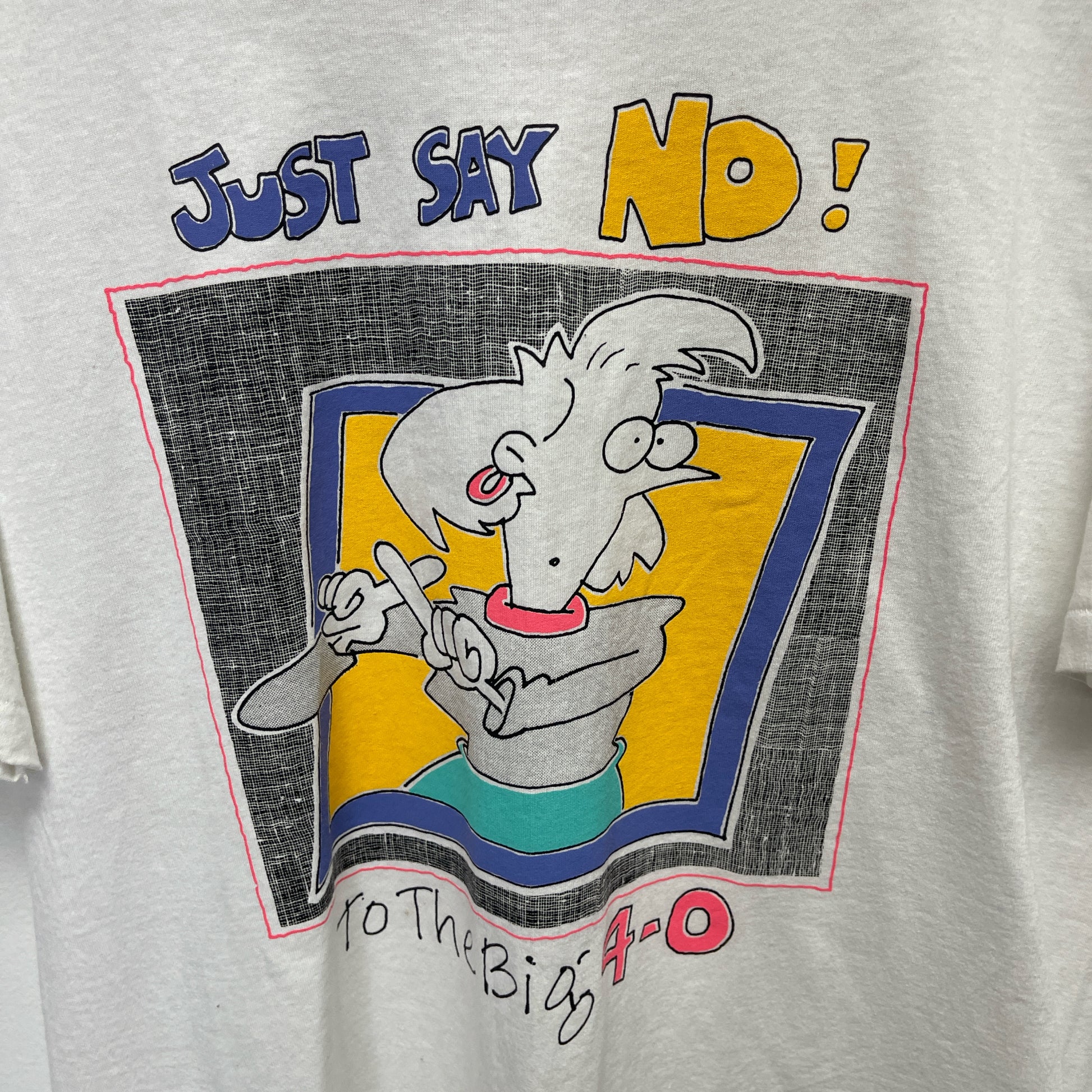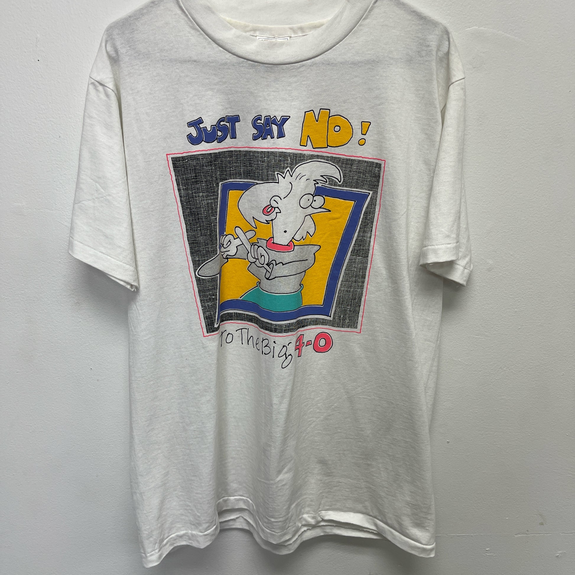 White vintage 90s graphic tee with "Just Say No" design clothing size Large